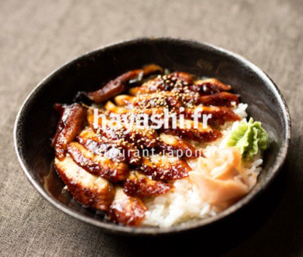 Tranches d'anguille grillée sur un grand bol de riz vinaigré, soupe, salade