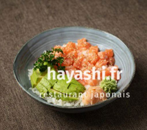 Cube saumon cru et avocat sur un grand bol de riz vinaigré, soupe, salade