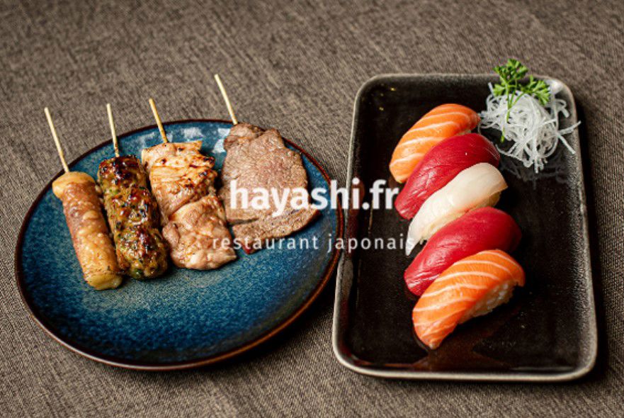 5 sushi, 4 brochettes: boulettes de poulet, boeuf, poulet, boeuf au fromage, soupe, salade, riz